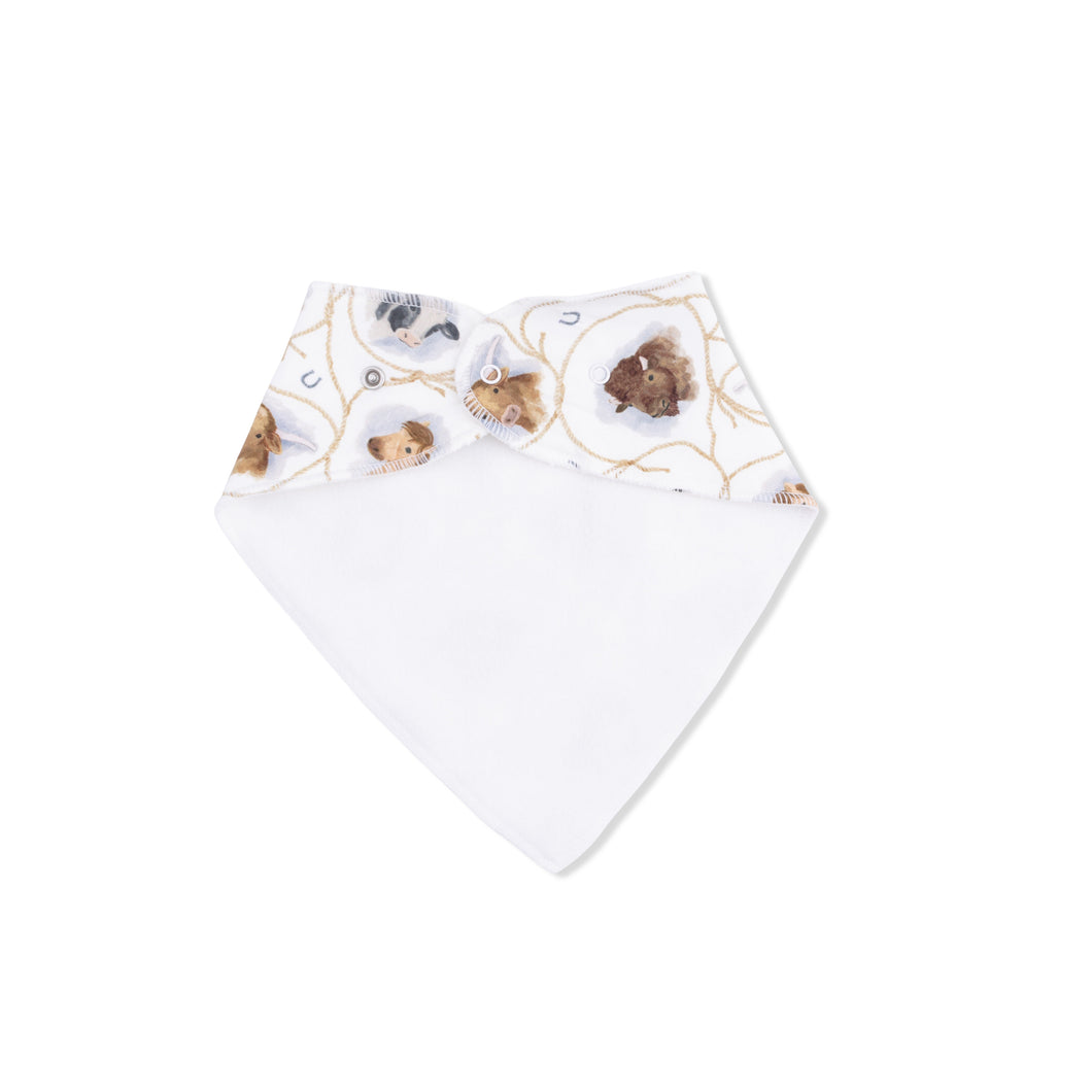 Adorable farm animals in silhouette dance around this cream-colored bamboo bib, each one framed by charming rope detailing. The adjustable snap closure grows with your little one, making it perfect from newborn through toddler stages. Soft, breathable bamboo keeps skin comfortable during messy meals and playtime. Coordinate with matching outfits and accessories to create a complete farm-themed look your child will love wearing again and again.