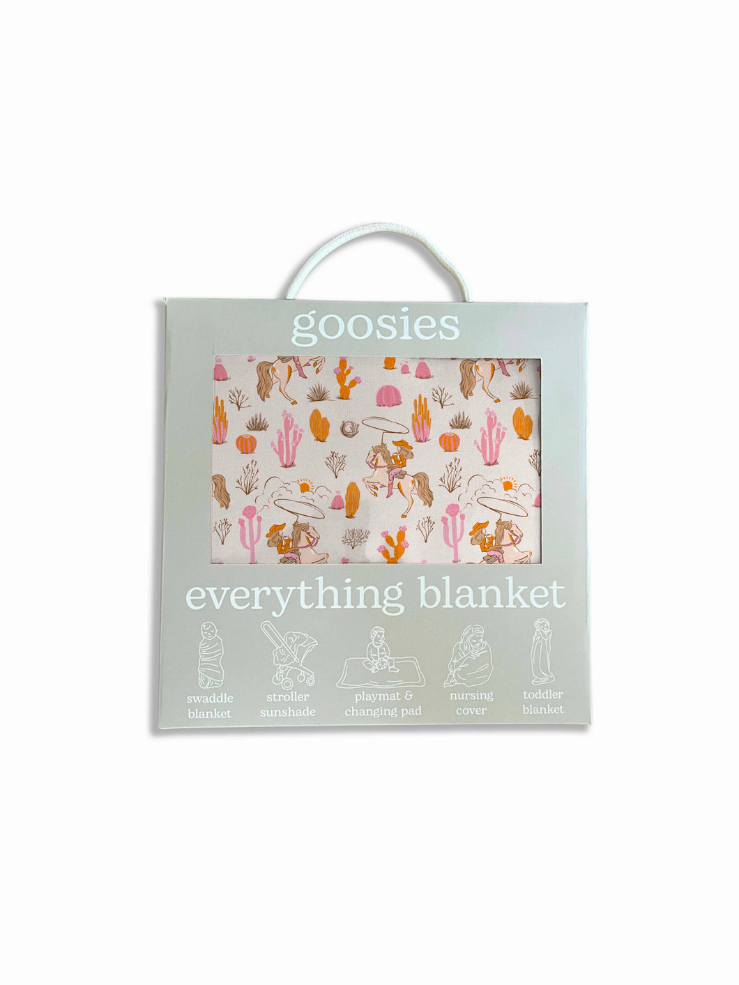 Not only is the Saddle Up, Cowgirl Blanket incredibly soft, but it's also versatile. Uses include: swaddle blanket, play mat, car seat cover, nursing cover and toddler blanket. The possibilities are endless with this multi-functional essential. It is packaged in an beautiful box that makes it a delightful gift! Fabric: 95% Bamboo, 5% spandex Size: Extra roomy 46" x 46" size. Care: Machine wash cold with like colors. Tumble dry on low, if needed.