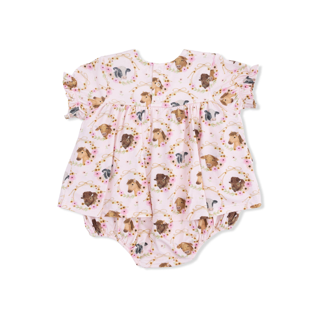 This adorable, smocked bodysuit features charming farm animal silhouettes with rustic rope detailing, perfect for your little one's wardrobe. Crafted from soft, breathable bamboo fabric, the babydoll style offers comfort and easy dressing with convenient snap closures. The sweet pink hue gives it a dainty touch. Coordinate with matching sibling styles to create precious twinning moments.