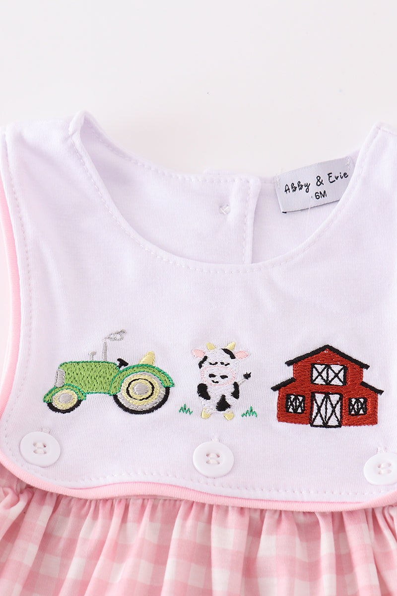 Get ready for fun on the farm with this adorable bubble romper! Featuring ruffles and a sweet gingham pink pattern, your little one will look cute as a button. Plus, the embroidered farm scene adds a playful touch. Perfect for any little country girl.