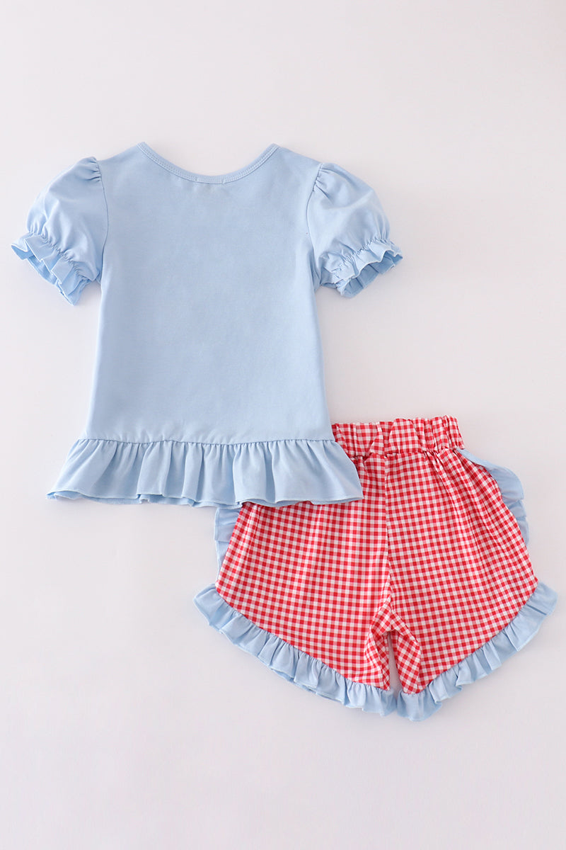 Get your little farm girl ready for a day of fun with our E-I-E-I-O Farm Girls Outfit Set! Made for toddlers, this cute set features a baby blue top with ruffled sleeves and hemline, adorned with adorable farm animal appliques. The coordinating red gingham shorts with blue ruffle trim complete the look for a perfect day.