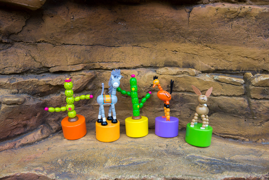 These friends will never desert you! Push the button and watch them droop - then let go to see them pop back into action. Set includes (5) styles: 2 cacti, roadrunner, hare, and donkey.